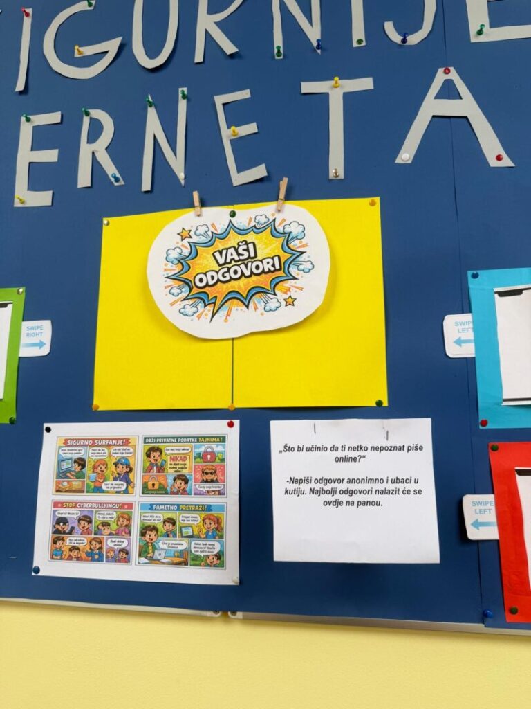 Veliki pano u hodniku škole obogaćen je stripom koji smo osmislili i izradili sami, kao i svim drugim vizualnim materijalima. Svojim radovima i komentarima pokazali su zrelost, kreativnost i spremnost za sigurno digitalno ponašanje.