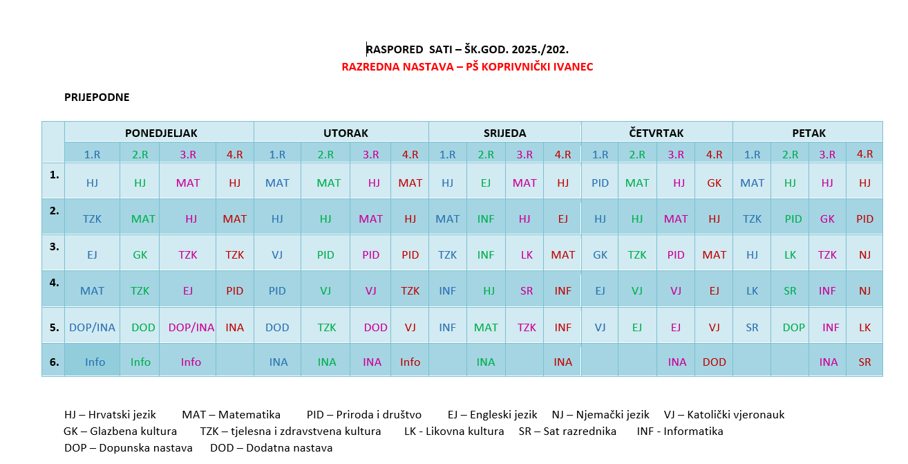 Na ovoj stranici možete pronaći rasporede sati za učenike od prvog do četvrtog razreda u Koprivničkom Ivancu i Kunovcu, te za učenike od petog do osmog razreda.